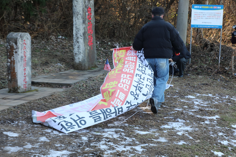 현수막은 한울누리공원 인근 박진경 대령 추도비 옆에 '바로 세운 진실' 안내판 등을 일부 가려왔다. 제주도 등은 추도비 옆에 객관적 사실에 근거한 역사적 사실을 바로 알리기 위해 지난해 12월 '바로 세운 진실' 안내판을 설치했다.