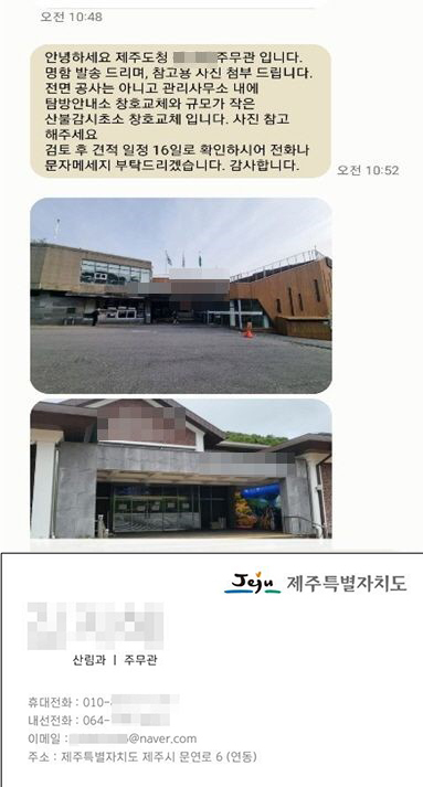 13일 제주도에 따르면 사칭범이 제주도청 산림과 주무관 명의를 도용한 위조 명함을 제작한 뒤 산불감시초소 설치·보수 또는 창호 교체 공사 등을 빌미로 관련 업체에 견적 요청 문자메시지를 발송한 것으로 파악됐다.