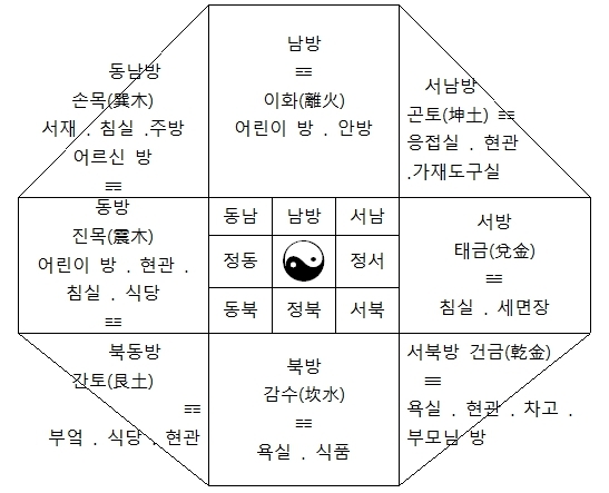 팔괘(八卦)의 방위에 의하면 북쪽은 욕실이나 식품을 보관하는 장소로 적합하고, 북동쪽은 부엌이나 식당 또는 현관의 위치로 알맞다. 동쪽은 해가 뜨는 방향으로써 어린이 방이나 현관 또는 침실, 식당이 위치하면 좋고, 동남쪽은 서재, 침실, 주방 또는 나이 드신 어르신들의 방으로 적합하다. 남쪽은 햇빛이 잘 들기 때문에 어린이 방이나 안방으로 적합하고, 남서쪽은 응접실이나 현관 또는 가재도구 실로 알맞다. 서쪽은 침실이나 세면장으로 적합하고, 서북쪽은 부모님 방이나 욕실, 현관, 차고 등으로 적합하나 절대적인 것은 아니고 집이나 방의 구조에 따라 적당하게 배치한다.