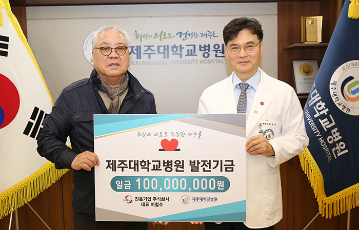 이철수 진흥기업 대표는 “도민의 한 사람으로서 우리지역의 의료 인프라가 강화돼 도민들이 더 나은 의료 혜택을 받기를 바라는 마음으로 기탁을 결심했다”며 "제주대병원이 지역 거점 의료기관을 넘어 상급종합병원으로 도약하는 데 작게나마 보탬이 되길 바란다"고 밝혔다.