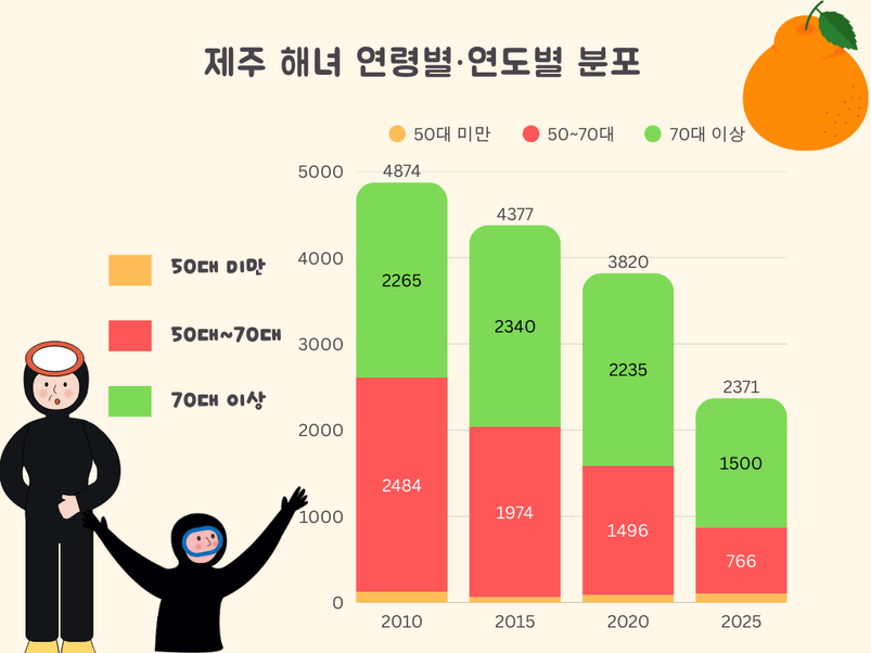 1970~80년대만 해도 2만여명을 웃돌랐던 제주의 해녀수 감소는 10여년 전으로 거슬러 비교하면 심각한 상황이다. 2010년 4874명이던 제주도내 해녀는 2015년 4377명, 2020년 3820명으로 급격히 줄어들었다.