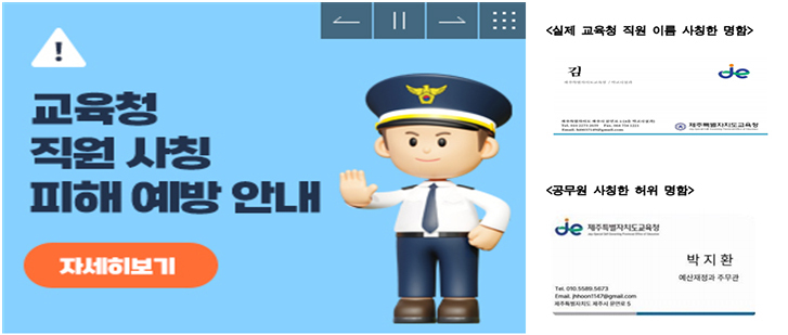 이들 사기꾼은 실제 제주교육청 로고와 주소, 부서 명칭, 소속 공무원 이름을 넣어 비교적 정교하게 만든 명함을 업체 대표 등에게 메시지로 보냈던 것으로 나타났다.