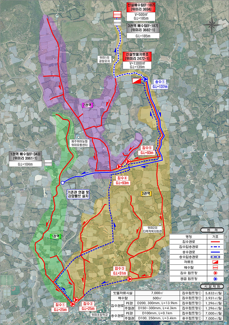 2028년 연말까지 서귀포시 남원읍 위미리 일원에 설치되는 이 시설은 위미리 일대 비닐하우스 168곳에 집수 설비를 달아 빗물을 받은 후 21.7㎞의 관로 망을 통해 7000톤 규모 저류조에 빗물을 모아둔다. 저류조에 채워진 빗물은 펌프로 관로 망을 따라 위미리 일원 농가 386곳에 농업용수로 보내진다.