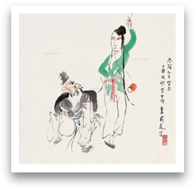 남자는 수숫대를 들고 여자는 화고를 흔들었다. 머리에는 덮개가 없는, 비로드로 만든 낡고 붉은 꽃을 몇 송이 꽂은 낡은 밀짚모자를 비뚜로 썼다. 머리 뒤로는 둥글게 묶고 작은 쪽을 만들어 닭털 같은 비녀를 꽂았다. 입술은 연지를 바르고 얼굴엔 분을 발라 소곡을 흥얼거리면서 북을 치며 춤을 추면 남자는 반주에 맞추어 움직였다.