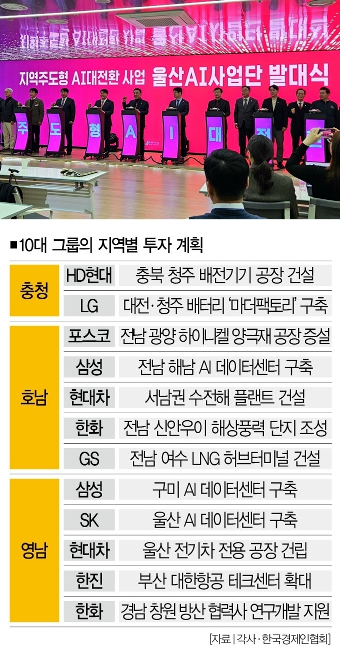 이 대통령은 서울에서 거리가 먼 지역에 지원을 늘리는 ‘가중지원 제도’와 RE100(재생에너지 100% 사용) 특별법 도입을 내세우며 지방에 더 기회 요소가 있다고 강조했다. 10대 그룹은 반도체 설비, 배터리, 인공지능(AI) 등 첨단ㆍ전략 산업을 중심으로 지방에 투자할 계획이다.