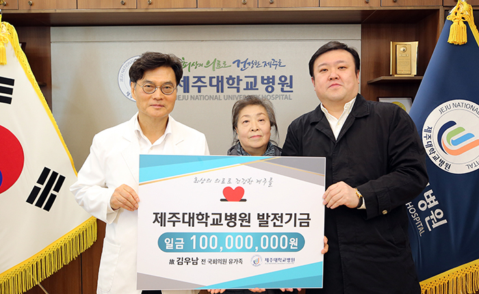 제17·18·19대 제주시을 지역구 3선 국회의원을 지냈던 고(故) 김우남 전 국회의원 유가족이 12일 제주대병원을 방문해 발전기금 1억원을 기부했다.