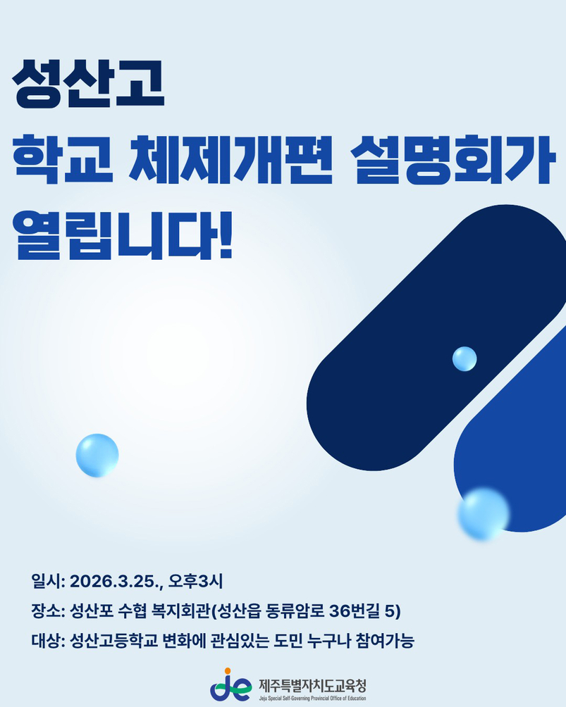 이를 위해 오는 25일 성산포수협복지회관에서 주민과 학생, 보호자 등이 참석한 가운데 '성산고 IB 도입 및 해양학과 재구조화 설명회'를 개최한다.