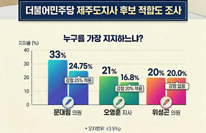 더불어민주당 제주도지사 후보 선출을 앞두고 실시된 2차 합동 여론조사에서 문대림 후보가 선두를 기록했다. 하지만 경선 감점 규정이 적용될 경우 세 후보 간 격차가 오차범위 내로 좁혀지며 승부를 예단하기 어려운 상황으로 나타났다.
