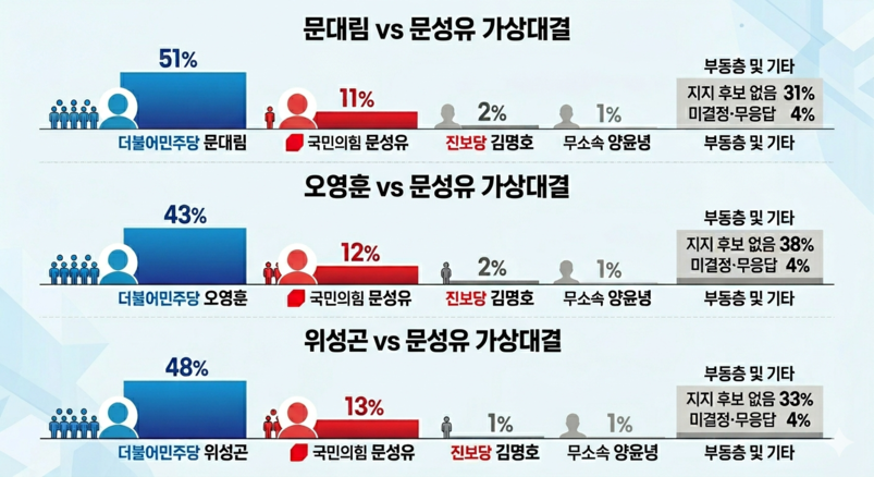 문대림 국회의원이 민주당 후보로 나설 경우 51%의 지지를 얻으며 과반을 넘겼다. 국민의힘 문성유 후보는 11%에 그쳤고, 진보당 김명호 2%, 무소속 양윤녕 1% 순으로 조사됐다. 지지 후보 없음은 31%, 미결정·무응답은 4%였다.