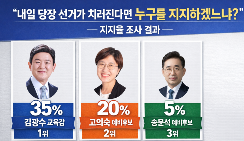 조사결과 ‘내일 당장 선거가 치러진다면 누구를 지지하겠느냐’는 질문에서 김광수 교육감이 35%로 가장 높은 지지율을 기록했다. 이어 고의숙 예비후보 20%, 송문석 예비후보 5% 순으로 나타났다.