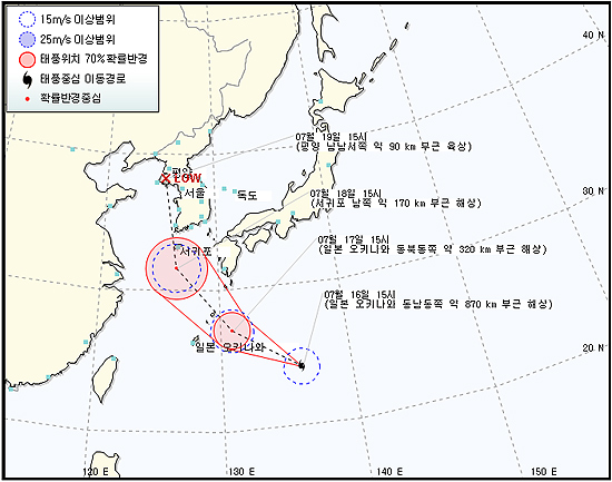 특히 오는 18일 오후 3시께에는 제주도 서귀포 남쪽 약 170km 부근 해상까지 진출해 제주도에 영향을 줄 것으로 전망되고 있다.