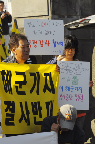 이어 국회의원이 탑승한 차량들이 제주도청으로 들어가자 강정마을회와 군사기지 저지 범도민대책위, 제주해군기지 저지 전국민대책회의 등 해군기지 반대측 50여명이 제주도청 정문에서 기자회견을 가졌다.