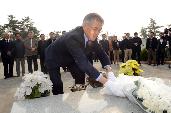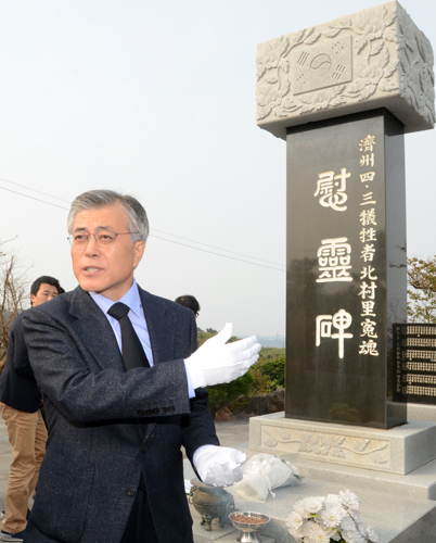 문재인 대선후보는 8일 오후 제주시 조천읍 북촌리 소재 4.3너분숭이 기념관에 들러 위령제단에 헌화하고 분향했다. 이어 기념관과 기념관 앞쪽 4.3당시 숨진 어린아이들의 무덤도 둘러봤다.