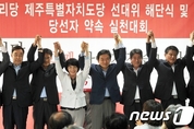 ▲ 9일 새누리당 도당 선대위 해단식 및 당선자 약속 실천대회 <Joins=뉴스1> 새누리당 제주도당 선거대책위원회가 해단식 · 당선자 약속 실천대회를 통해 행복도민시대를 열겠다고 약속했다. 새누리당 제주도당은 9일 새누리 제주도당사에서 새누리당 제주도당 선대위 해단식 · 당선자 약속 실천대회를 갖고 "행복한 제주도민의 시대. 새누리 제주도당이 열어나가겠다"고 선언했다. 이 자리에는 강지용 도당위원장, 원희룡 제주도지사 당선인과 도의원 당선자 등이 참석했다. 강지용 도당위원장은 "당원의 정성으로 19년만에 새누리당 도지사 후보가 압도적으로 당선됐다. 도민에게 감사드린다"며 “아무런 대가를 바라지 않고 새누리당이 힘들 때 도와주신 모든 분들게 감사드린다. 원 당선인이 제주의 가치를 두 배로 높이고 통합시키는 데 우리 새누리당이 앞장서서 임해줄 것을 부탁드린다”고 말했다. ▲ 원희룡 당선인 <Joins=뉴스1> 원희룡 제주도지사 당선인은 "이번 선거는 도민의 뜻에 따른 결정이다. 선거는 비록 끝났으나 제주호(號) 자동차가 잘 가기 위해서는 좋은 액셀