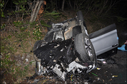 ▲ 교통사고로 뒤집힌 자동차. 보닛이 심하게 찌그러졌다. / 사진=서귀포소방서 [기사종합]봄을 맞아 제주 관광에 나섰던 일가족 6명이 사고를 당했다. 이 사고로 할아버지와 할머니, 손녀가 목숨을 잃었다. 하지만 사고원인은 밝혀지지 않았다. 참변을 부른 이 교통사고의 원인은 무엇일까? 하지만 운전자가 숨지고 차량 탑승자 대부분 중상을 입거나 생명이 위태로운 상태다. 단지 차량에 블랙박스가 있어 이를 통해서 사고원인이 규명될 것으로 보인다. 28일 오후 7시쯤 서귀포시 남원읍 5.16도로 숲터널 근처에서 윤모(60)씨가 몰던 산타페 차량이 뒤집히는 사고가 발생했다. 이 차량은 당시 서귀포시에서 제주시 방향으로 이동하던 중이었다. 당시 조수석에는 윤씨의 부인(56)이 타고 있었고 뒷좌석에는 아들 윤모(33)씨와 며느리 양모(33)씨, 손자(4), 손녀(2)가 타고 있었다. 차량은 5.16도로 숲터널에 들어서기 약 500미터 전 커브길에서 중앙선을 넘어 맞은편 고랑에 뒤집힌채 처박혔다. 보닛은 심하게 부서졌다. 신고를 받고 출동한 119는 차량 안에서 6명을 구조했다. 그러나 운전자 윤씨와 조수석에 앉아있던 윤씨 부부는 의식을 회복하지 못하고 현장에서 목숨을 잃었