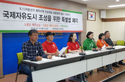 ▲ 노동당 제주도당, 민중당 제주도당, 제주녹색당 등 제주지역 진보정당 관계자들이 17일 제주도의회 도민의 방에서 기자회견을 열고 국제자유도시 조성을 위한 특별법 폐지를 촉구하고 있다. 2018.05.17. 민중당.노동당.제주녹색당 등 제주지역 진보정당이 “국제자유도시 조성을 위한 특별법을 폐지하고 국제생태평화도시 특별법으로 전환하라”고 촉구했다. 이들은 17일 제주도의회 도민의 방에서 기자회견을 열고 “제주도의 비전을 중앙정부가 법으로 ‘국제자유도시’라 규정하고 있다”며 “법의 보호 아래 제주국제자유도시개발센터(JDC)는 2014년과 2015년 2년 동안 토지강제수용 후 택지개발과 분양사업으로만 700억원이 넘는 순이익을 챙겼다”고 말했다. 모두 발언자로 나선 고은영 제주녹색당 제주도지사 예비후보는 “제주 구석구석이 공사판인 상황에서 제주 본연의 가치를 되새기고자 하는 도민들의 공감대가 형성되고 있다”며 “진보 3당은 국제자유도시가 아닌 다른 비전을 말하기 위해 이 자리를 마련했다”고 취지를 설명했다