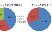 제주도교육감 선거 여론조사에서 이석문 예비후보가 김광수 예비후보를 11.5%P 차로 앞서는 것으로 나타났다. KBS제주방송총국은 도민 여론조사 결과 이석문 후보의 지지율이 36.9%, 김광수 후보는 25.4%로 나타났다고 지난 15일 밤 보도했다.. 지지율 격차는 11.5%p다. 하지만 응답자 4명 가운데 1명 꼴인 26.9%는 '누구에게 투표할지 모르겠다'고 응답했다. 연령대별로 보면 이석문 예비후보가 모든 연령대에서 김광수 예비후보 보다 지지율이 높았다. 특히 40대에서 두드러졌다. 직업별 지지도에선 김광수 예비후보는 생산직과 주부층에서, 이석문 예비후보는 농어업인과 자영업, 사무직층에서 상대적으로 높은 지지를 얻었다. 당선 가능성은 이석문 예비후보가 45.3%, 김광수 예비후보가 20%로 격차가 더 벌어졌다. 이번 여론조사는 KBS제주방송총국이 여론조사전문기관 한국리서치에 의뢰해 지난 12일과 13일 이틀 동안 만 19세 이상 도민 1000명을 대상으로 실시했다. 응답률은 16.9%다. 무선전화 비율은 69%, 유선전화는 31%다. 표본오차는 95% 신뢰수준에 ±3.1%p다. 자세한 내용은 중
